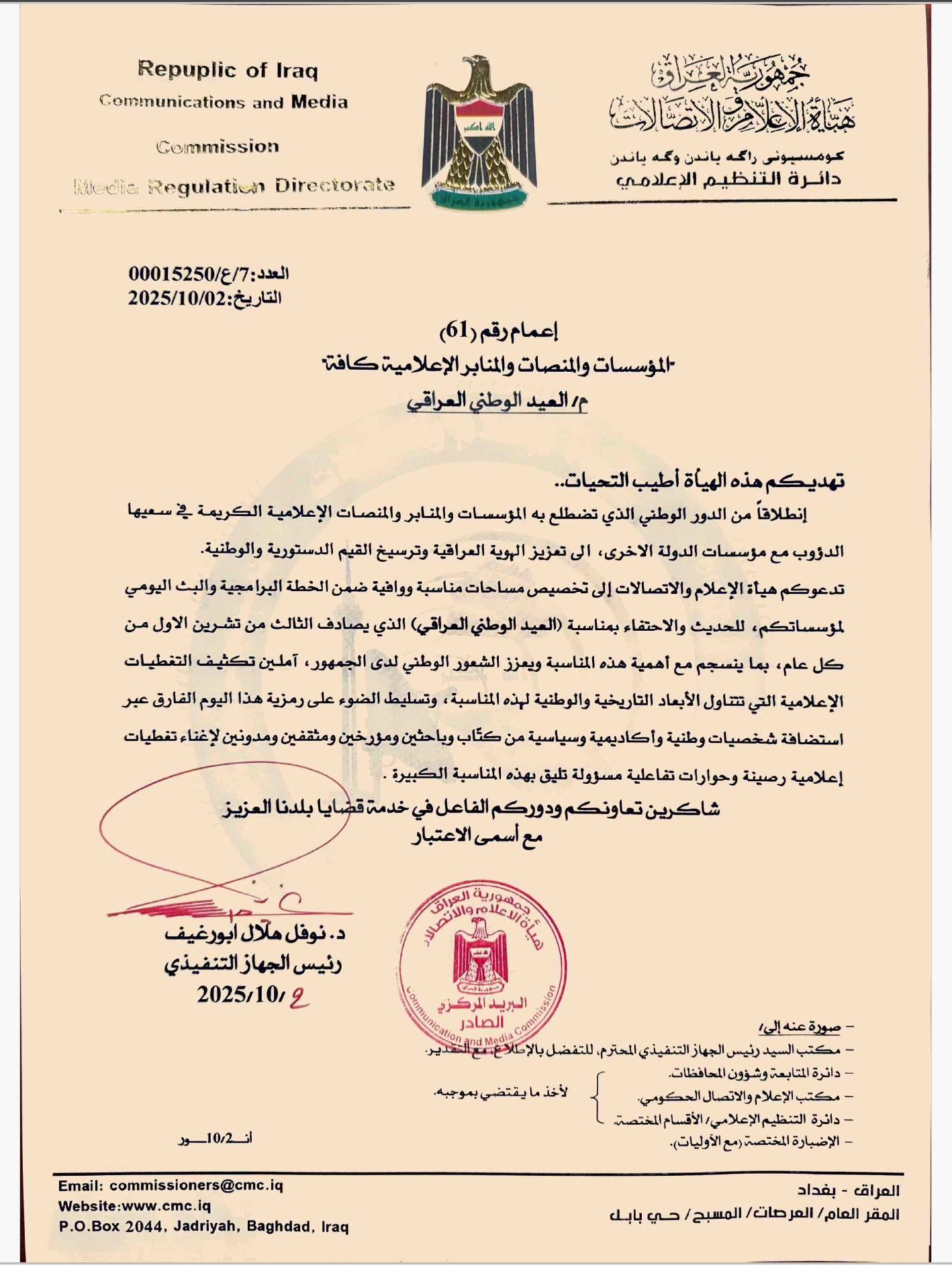 أصدرت هيئة الإعلام والاتصالات، اليوم الخميس، إعماماً إلى المؤسسات الإعلامية كافة بضرورة الالتزام باستخدام الشعارات والهوية البصرية الرسمية الخاصة بالعيد الوطني العراقي الذي يصادف الثالث من تشرين الأول.