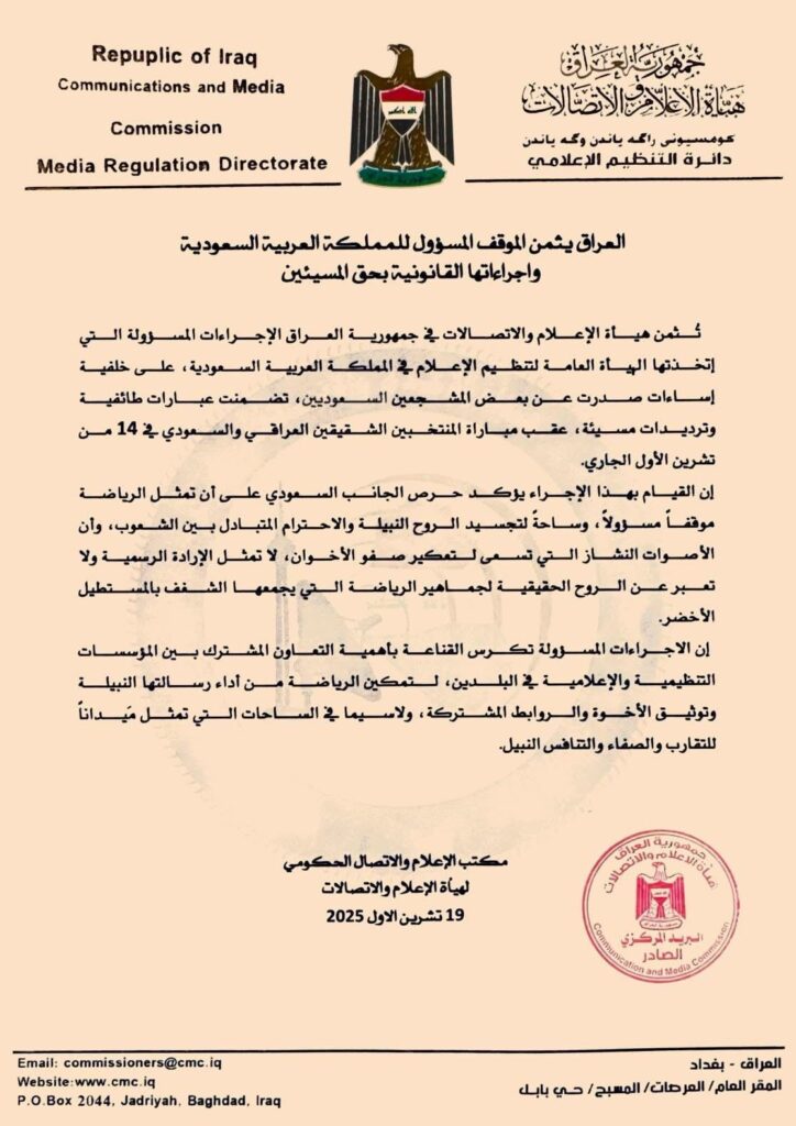 ثمّنت هيأة الإعلام والاتصالات، اليوم الأحد، الموقف المسؤول الذي اتخذته الهيأة العامة لتنظيم الإعلام في المملكة العربية السعودية بإجراءاتها القانونية تجاه المسيئين الذين صدرت عنهم عبارات طائفية خلال المباراة التي جمعت المنتخبين العراقي والسعودي في الرابع عشر من تشرين الأول الجاري.