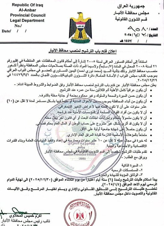 محلي الحلبوسي يؤكد التزام مجلس النواب بالعمل المشترك مع رئاسة الجمهورية والسلطات الدستورية 12:36 05/01/26